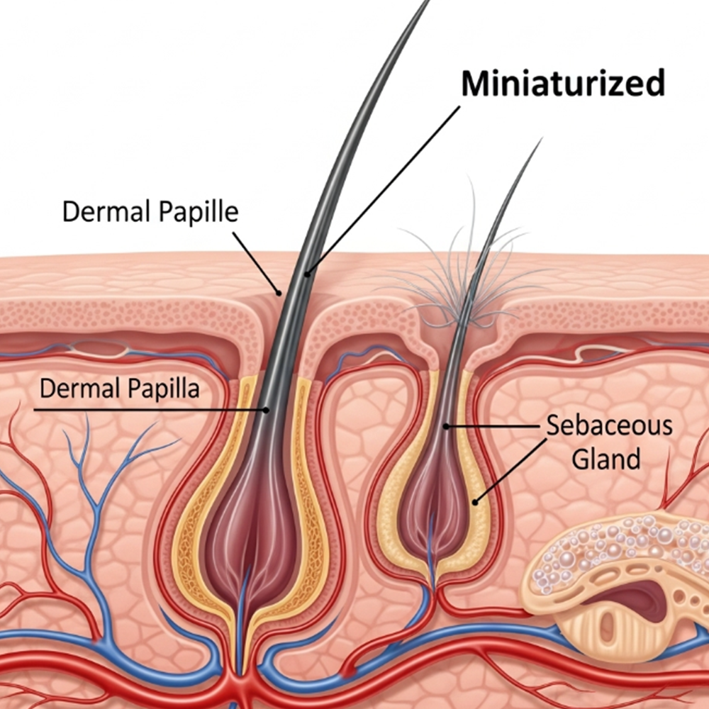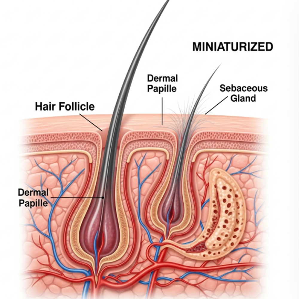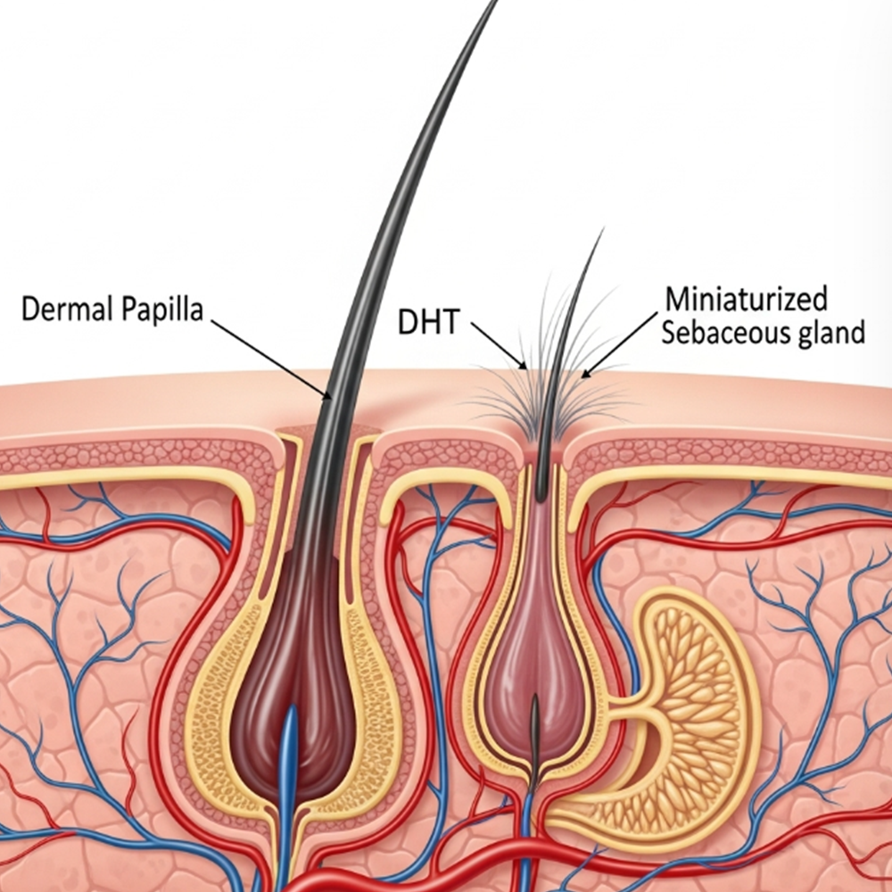 - 모낭 공격: DHT는 특정 모낭(주로 앞머리와 정수리)에 작용하여 모발의 성장기를 짧게 만들고 모낭을 점차 위축시킵니다.