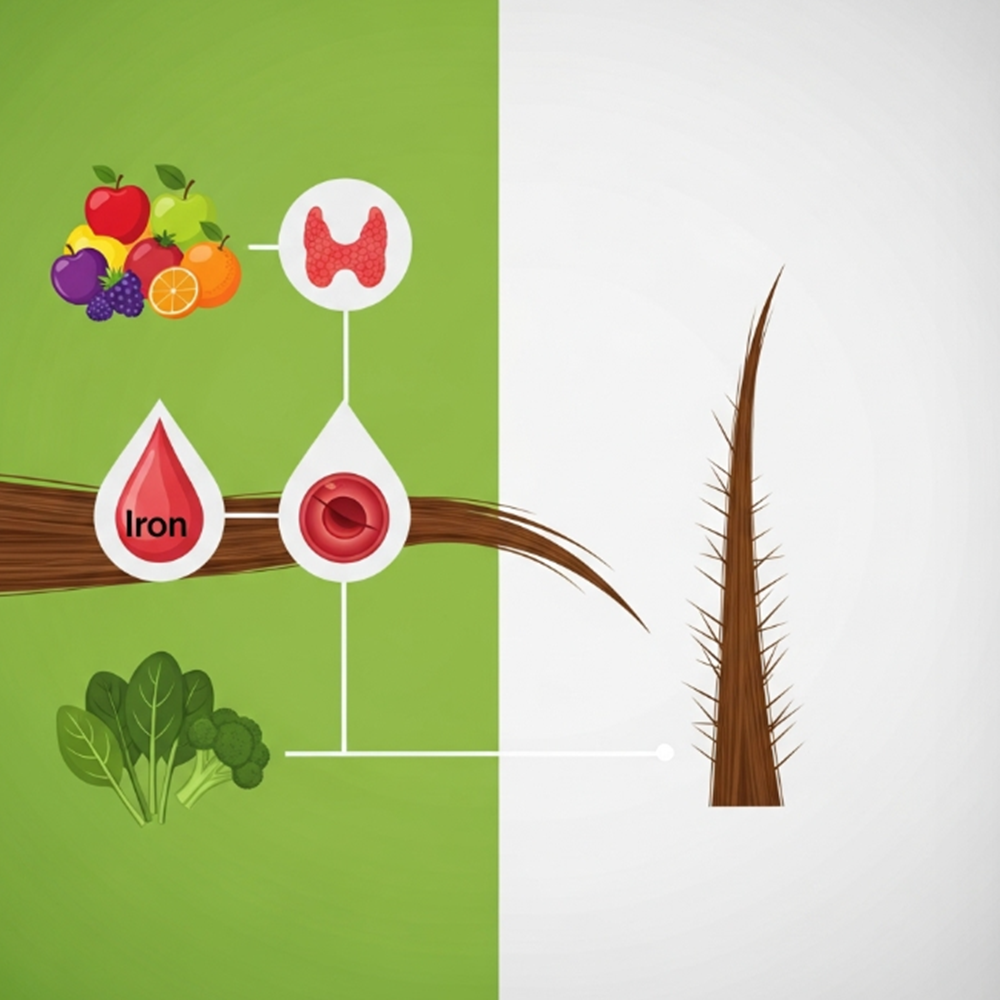 무리한 다이어트나 편식으로 인해 모발 성장에 필수적인 단백질, 철분, 아연, 비타민 B군 등이 부족해지면 머리카락이 가늘어지고 빠집니다. 특히 여성의 빈혈은 탈모의 중요한 원인 중 하나입니다.